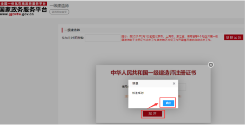 按钮,提示"加注成功!"表示电子证照加注完成,加注有效期为180天。
